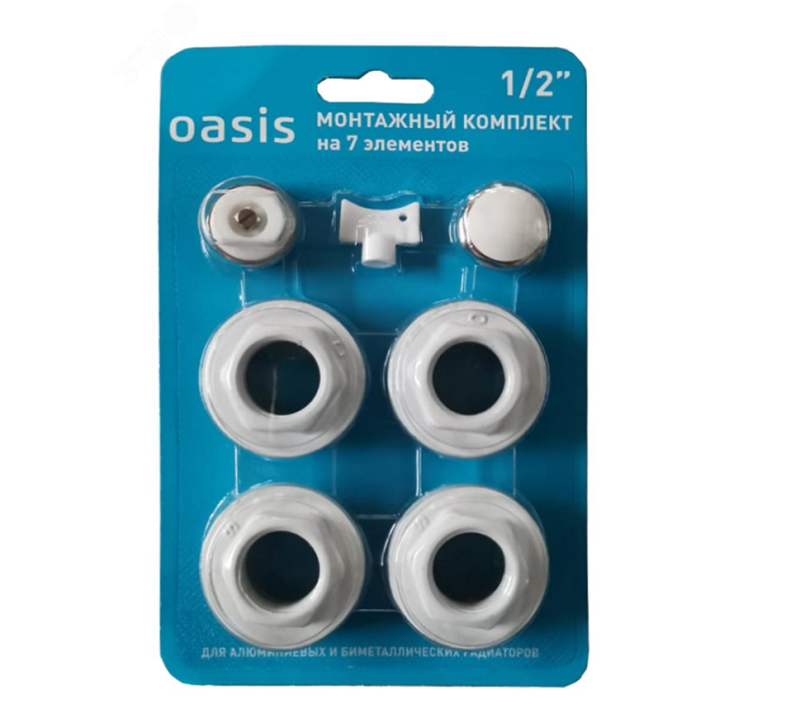 Комплект предназначен для монтажа алюминиевых и биметаллических радиаторов с присоединительным размером верхнего и нижнего коллекторов 1" (внутренняя резьба). В состав набора включены четыре футорки 1 x ½" – две правые и две левые. Футорки выполнены из оцинкованной стали, окрашены белой эмалью, снабжены прокладками. Также в комплект включены пробка для футорки, ручной самоуплотняющийся воздухоотводчик, ключ для воздухоотводчика, 2 стальных кронштейна для радиатора и 2 пластиковых дюбеля. Элементы комплекта рассчитаны на рабочее давление до 16 бар.